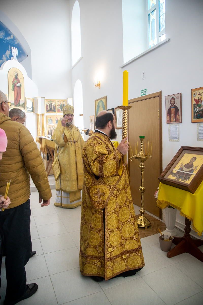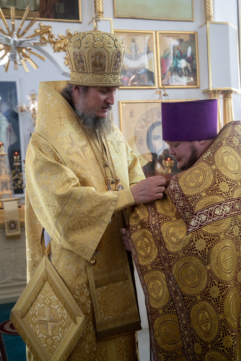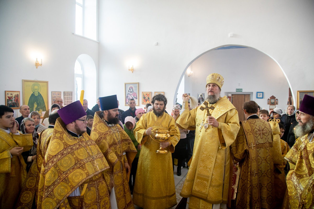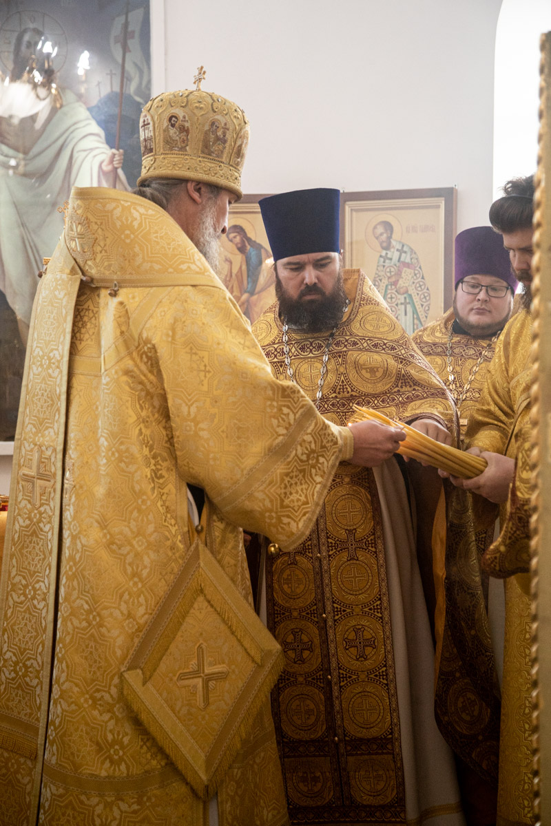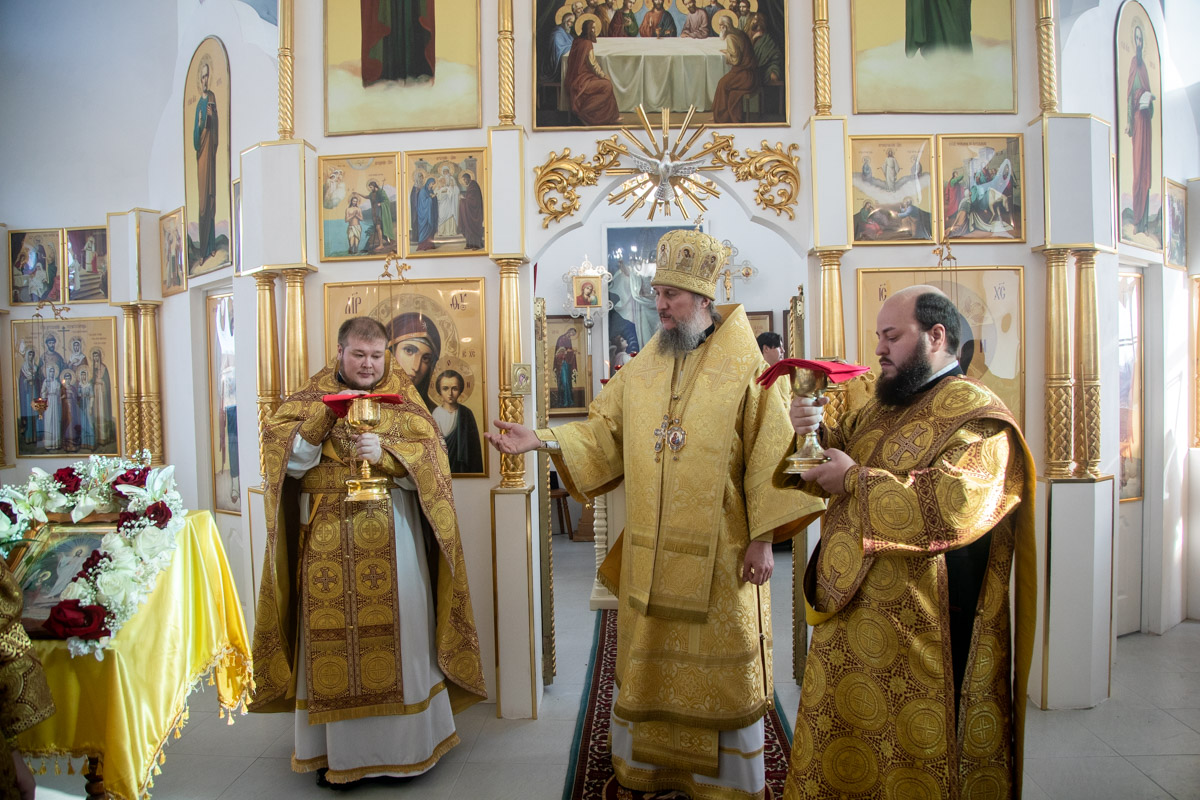 Его Преосвященству сослужили: секретарь епархиального управления иерей Виктор Тихонов, протоиерей Герман Чурашов, настоятель храма иерей Сергий Ярушев, иерей Димитрий Яковлев, иеродиакон Мефодий (Копьев), диакон Алексий Ведерников.