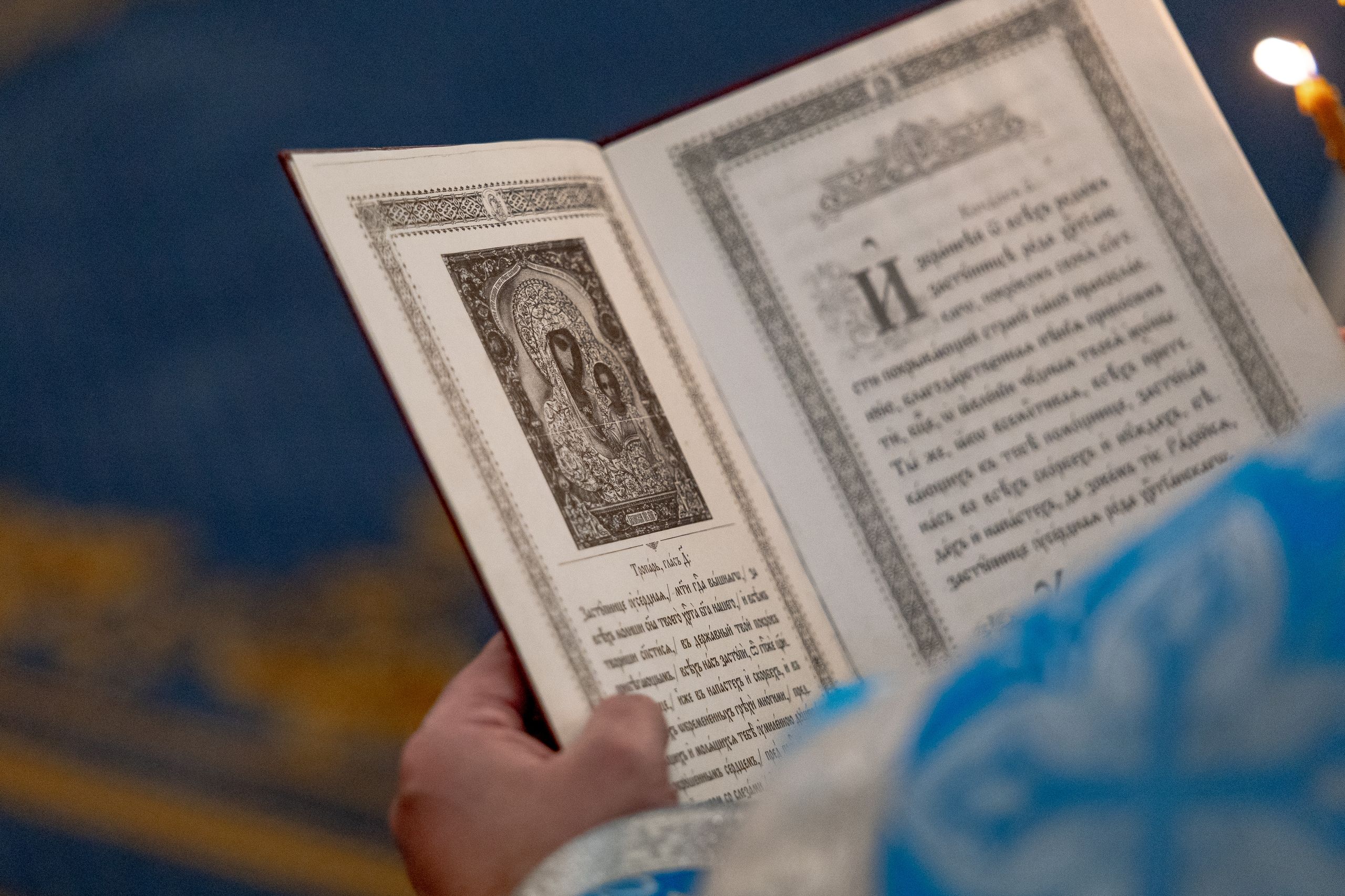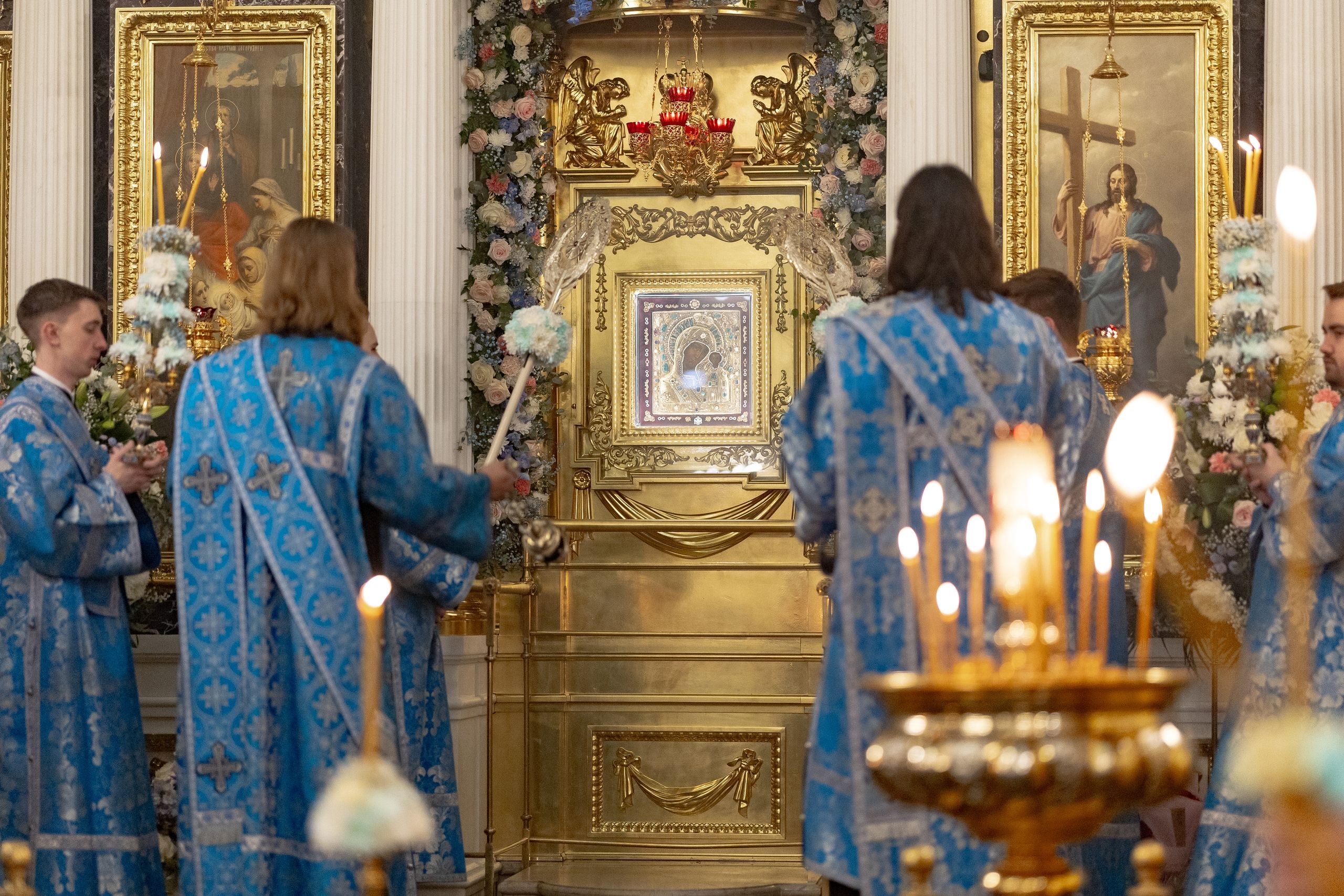 За полиелеем архипастыри и духовенство пропели акафист Пресвятой Богородице перед Её чтимым образом в правом приделе собора. В завершение богослужения духовенство совершило славление Царице Небесной.