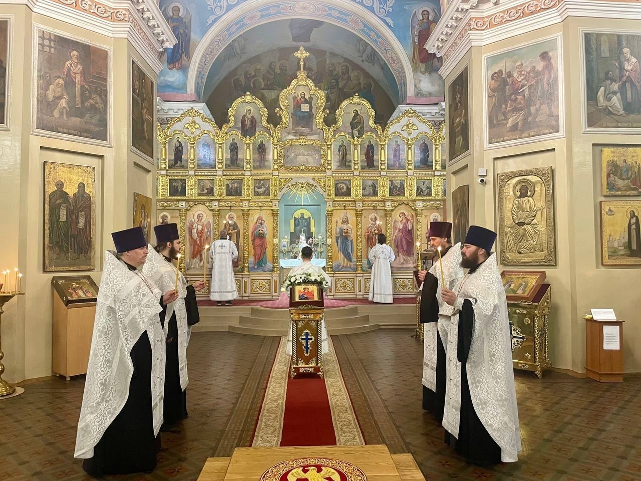 Его Преосвященству сослужили: ключарь собора иерей Виктор Тихонов, иерей Николай Андриевский, иерей Виталий Гарабов, иерей Даниил Щербаков, диакон Алексий Ведерников, диакон Иоанн Дунаев.