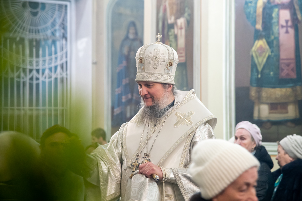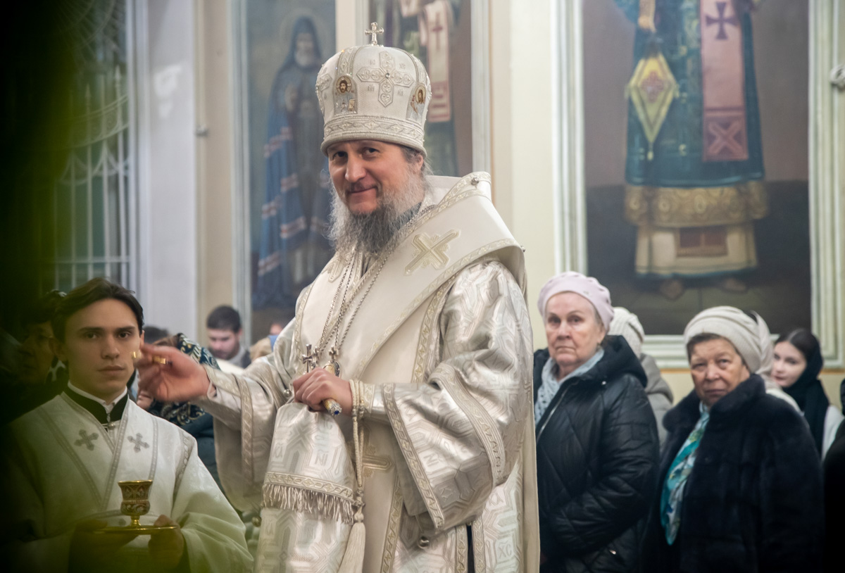 Его Преосвященству сослужили: ключарь собора иерей Виктор Тихонов, иерей Николай Андриевский, иерей Виталий Гарабов, иерей Даниил Щербаков, диакон Алексий Ведерников, диакон Иоанн Дунаев, диакон Димитрий Шувалов, диакон Иоанн Щегольков.