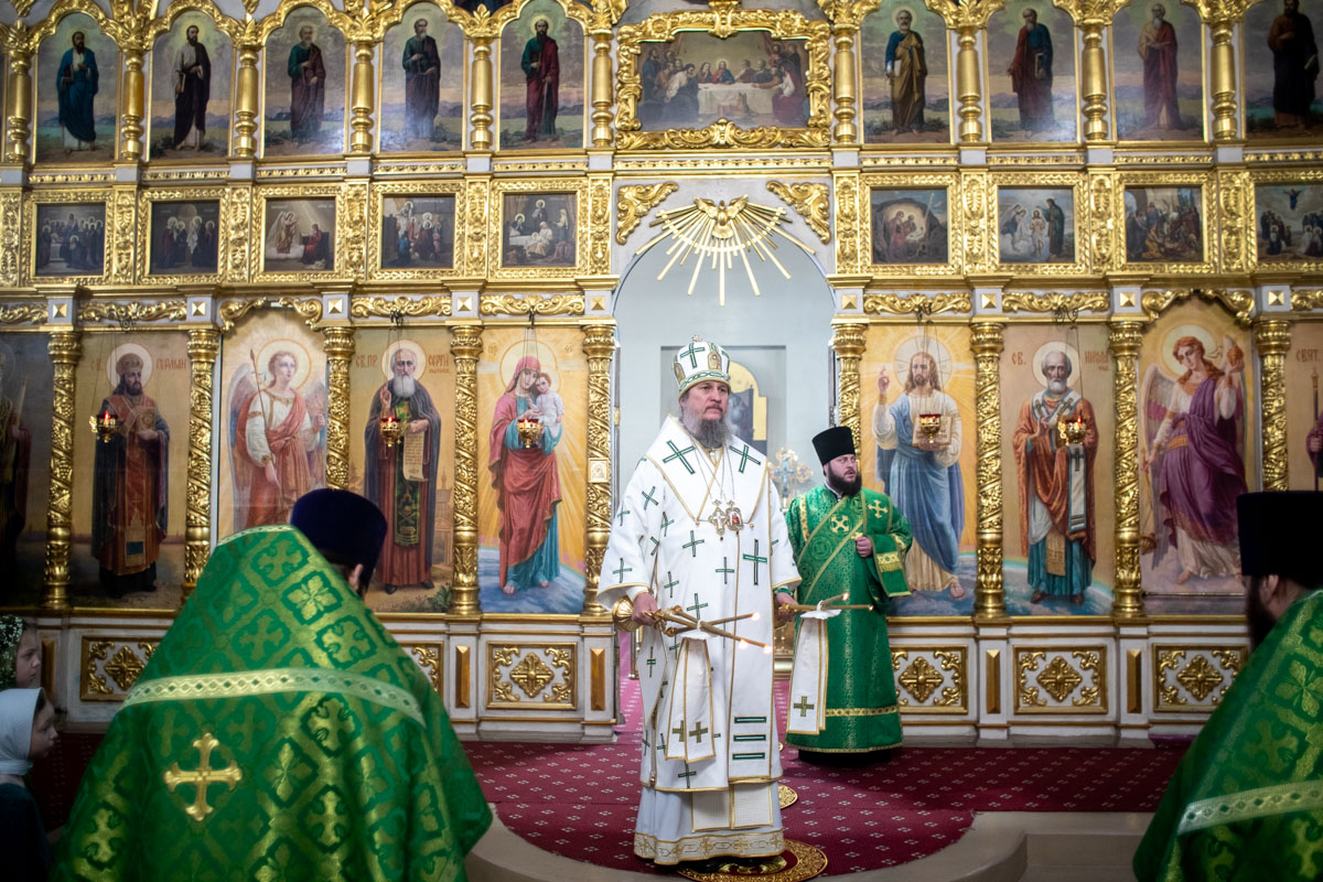 Его Преосвященству сослужили: ключарь собора священник Виктор Тихонов, иерей Николай Андриевский, иерей Виталий Гарабов, иерей Даниил Щербаков, иерей Павел Силайчев, диакон Алексий Ведерников, диакон Иоанн Дунаев.