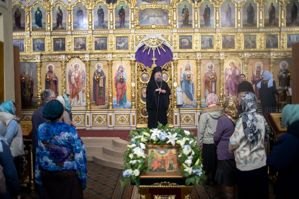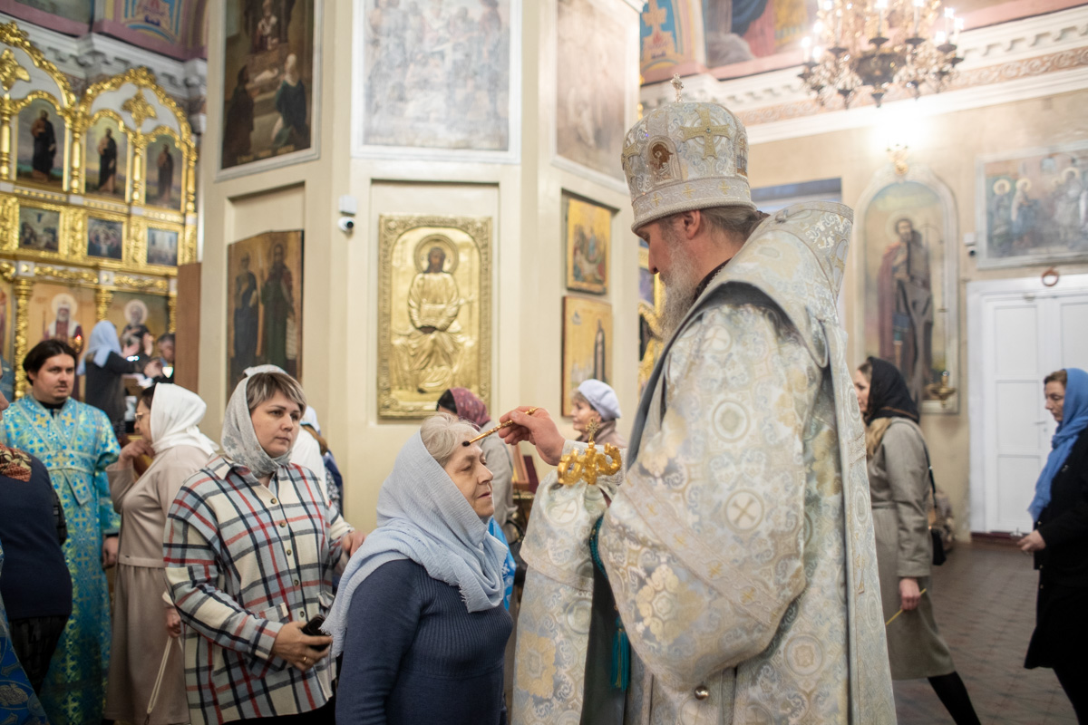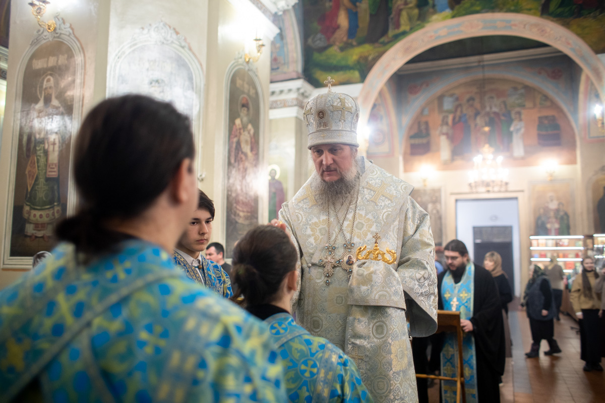 Его Преосвященству сослужили: ключарь собора священник Виктор Тихонов, иерей Николай Андриевский, иерей Виталий Гарабов, иерей Даниил Щербаков, иерей Павел Силайчев, диакон Алексий Ведерников, диакон Иоанн Дунаев.