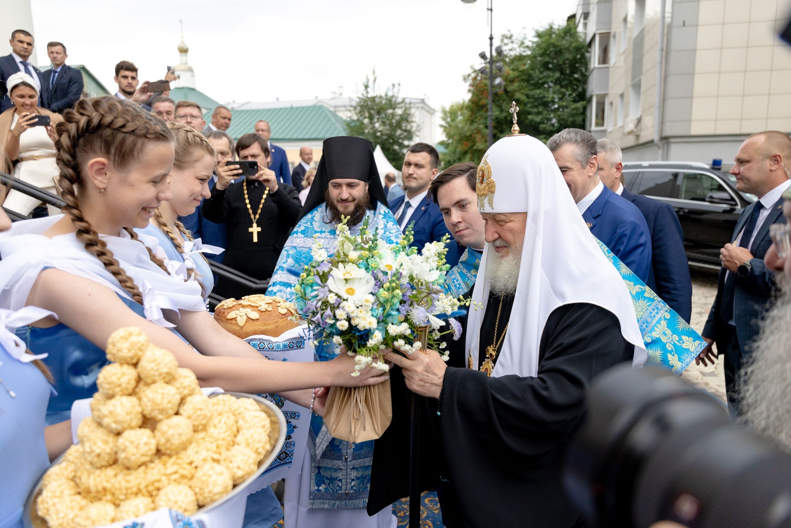 У входа в собор Святейшего Патриарха встречали Раис Республики Татарстан Р.Н. Минниханов; митрополит Казанский и Татарстанский Кирилл; председатель Либерально-демократической партии России, председатель Комитета Государственной Думы Федерального Собрания Российской Федерации по международным делам Л.Э. Слуцкий; учащиеся воскресной школы прихода преподобного Серафима Саровского г. Казани.