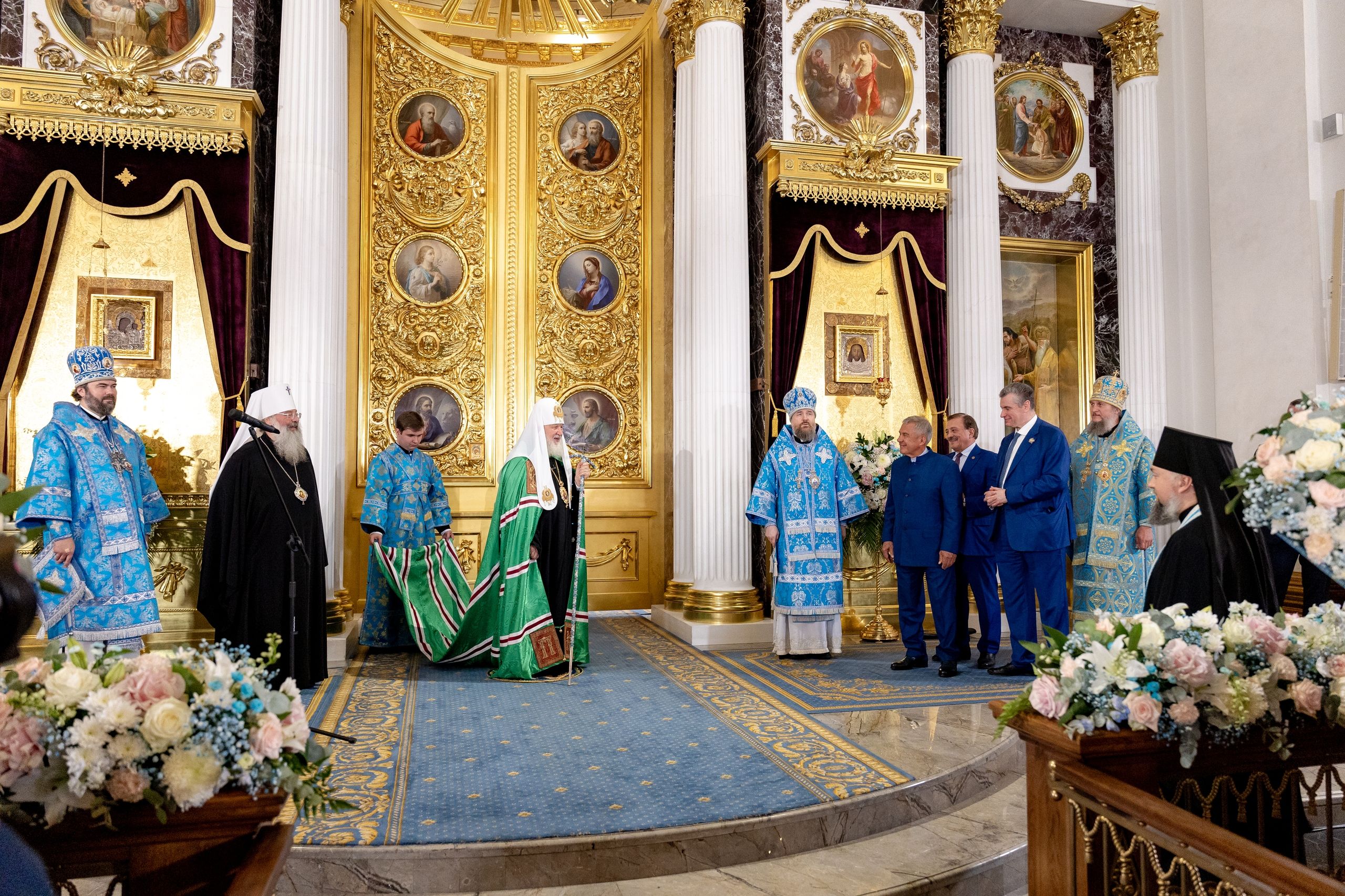 Митрополит Казанский и Татарстанский Кирилл от лица архиереев, духовенства и верующих Татарстанской митрополии приветствовал Святейшего Владыку и преподнес в дар старинный Казанский образ Божией Матери, украшенный сестрами Казанского Богородицкого женского монастыря. В дар Казанскому собору Святейший Владыка передал Жировицкую икону Божией Матери.