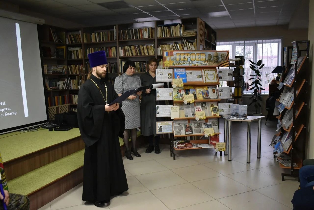 Отец Серафим говорил о примерах героизма на фронте и в мирное время, о воспитании необходимых для этого личностных качеств. Школьники и педагоги размышляли о том, кого можно назвать героем, чему учит пример героев разных эпох. Сотрудники библиотеки познакомили с книгами на данную тему. «Героями не рождаются, а становятся» – эти слова неоднократно вспоминали в этот день.