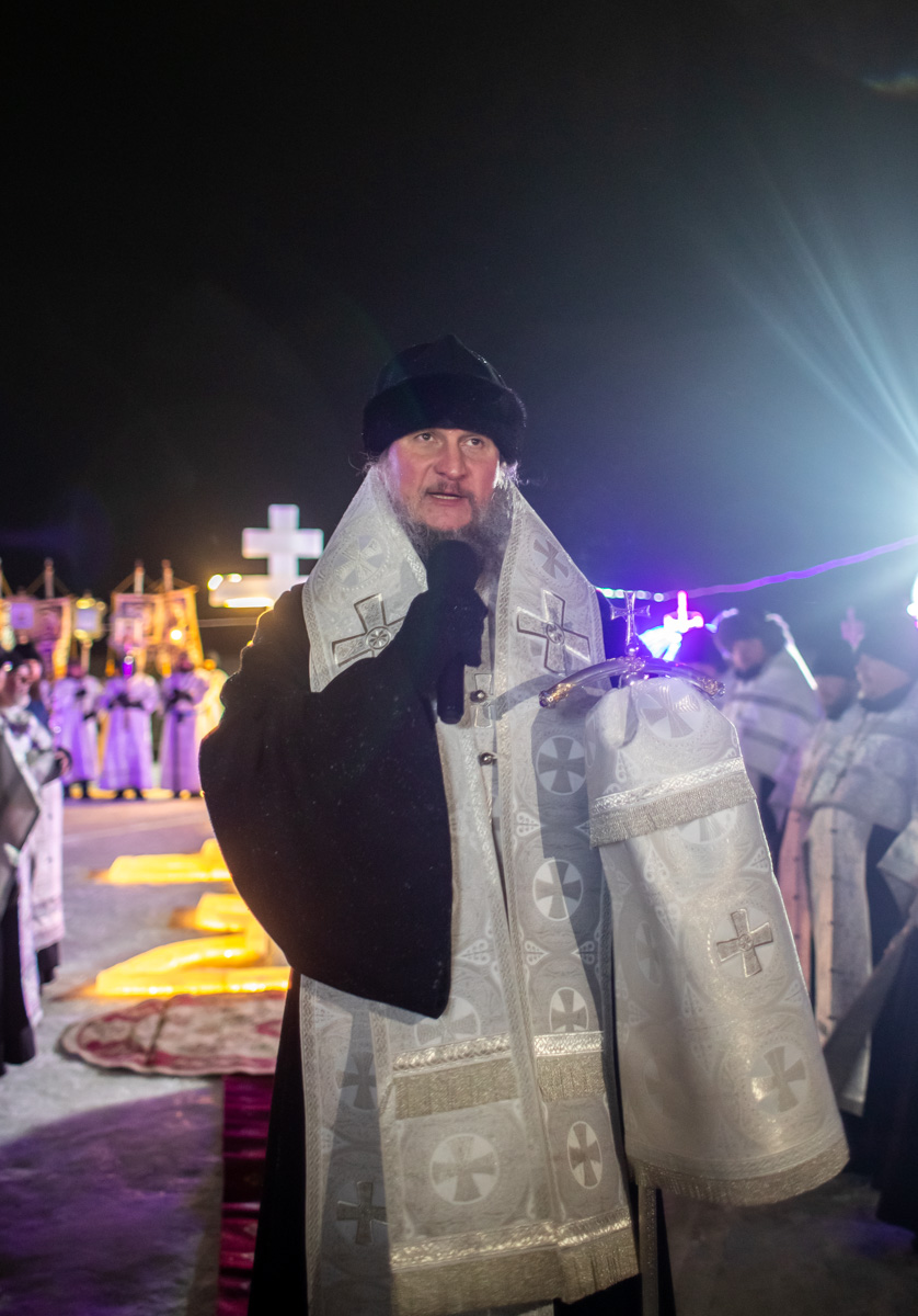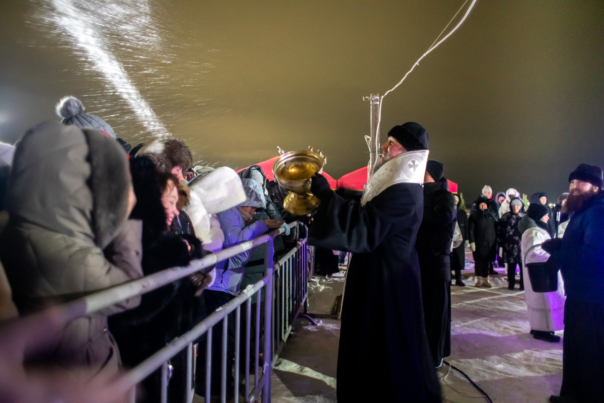 У специально вырубленной в виде креста проруби с ледяным распятием – «иордани» – владыка совершил чин великого освящения воды и окропил молящихся святой водой. "В эти дни стоит морозная погода, потому от всей души хочется поблагодарить батюшек и мирян, которые потрудились здесь, на берегу, чтобы у всех было ощущение настоящего праздника", - поделился иерей Виктор Тихонов.