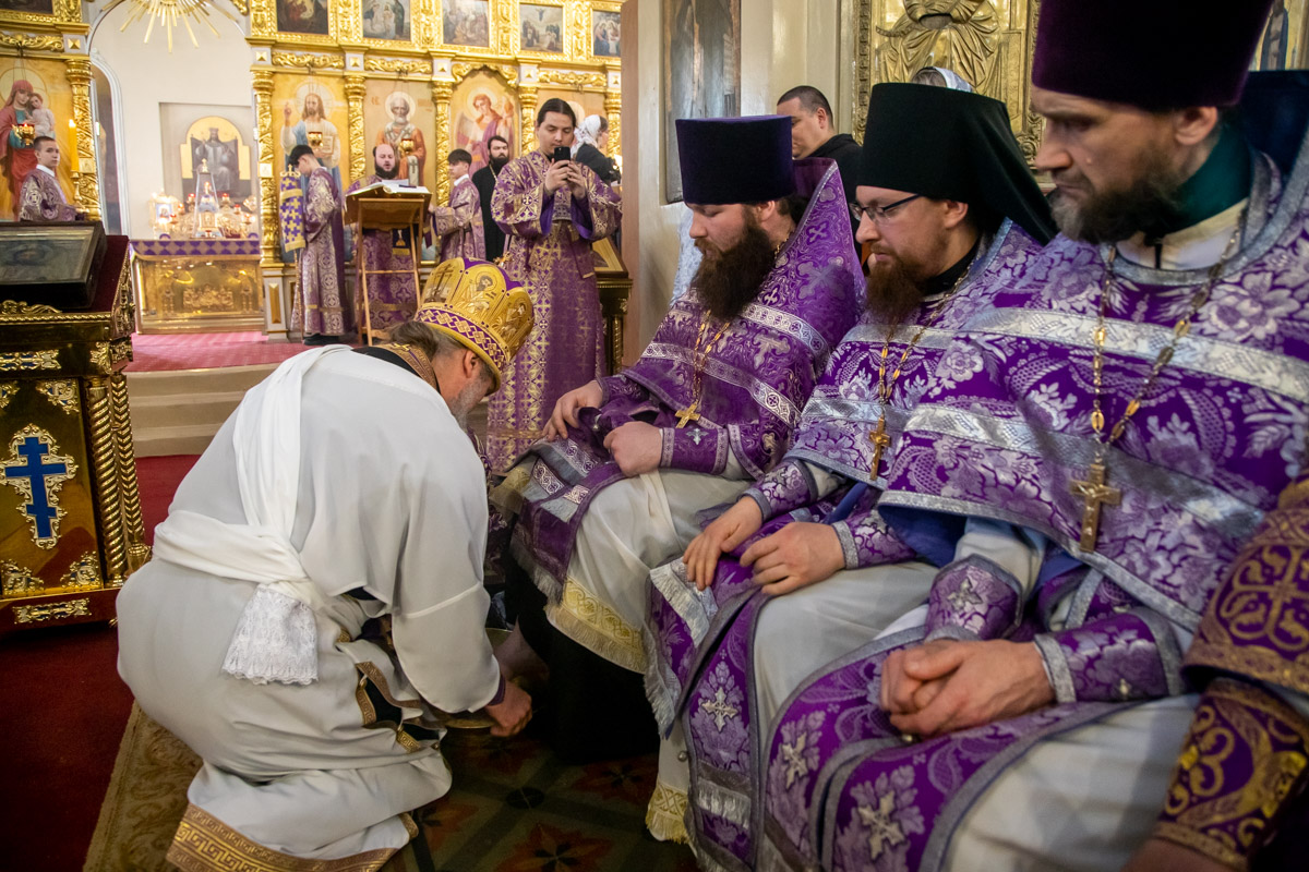 Последний священник, символически изображающий апостола Петра, сначала отказывается от умовения, но после слов: «Аще не умыю тебе, не имаши части со мною» (Ин. 13, 8), смиряется. «На Востоке омовение всегда давал младший старшему. Христос нарушает этот порядок, показывая Своим ученикам образ смирения и любви», – пояснил архипастырь.
