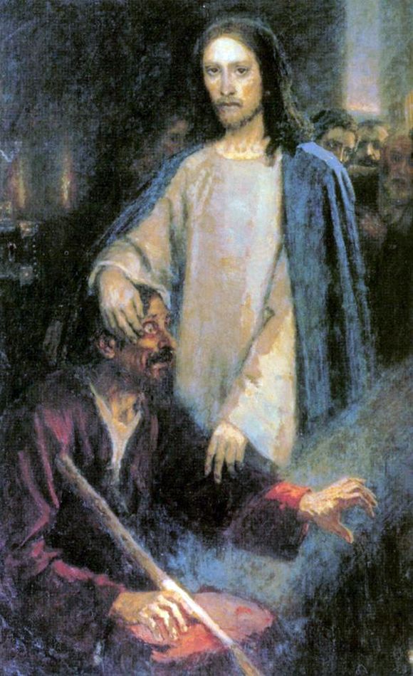 «Иисус увидел на дороге слепца и открыл ему незрячие очи. И, проходя, увидел человека, слепого от рождения. Ученики Его спросили у Него: Равви! кто согрешил, он или родители его, что родился слепым? Иисус отвечал: не согрешил ни он, ни родители его, но это для того, чтобы на нем явились дела Божии. Мне должно делать дела Пославшего Меня, доколе есть день; приходит ночь, когда никто не может делать. Доколе Я в мире, Я свет миру. Сказав это, Он плюнул на землю, сделал брение из плюновения и помазал брением глаза слепому, и сказал ему: пойди, умойся в купальне Силоам, что значит: посланный. Он пошел и умылся, и пришел зрячим» (Ин. 9: 1–7).