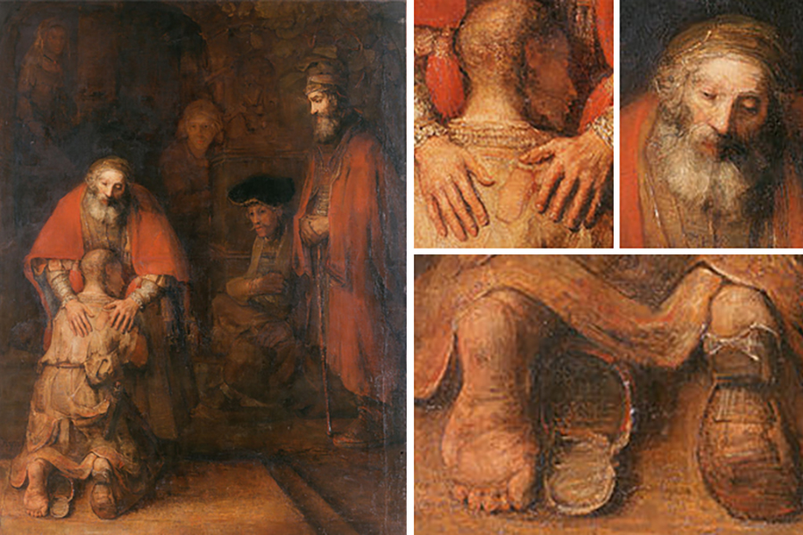 Образ отца соединяет в себе царственность и человечность. Руки он не судорожно, не лихорадочно, а умиротворенно возложил на плечи сына. В этом жесте все: и прощение, и благословение, и защита, и поддержка. Исследователи отмечают характерную деталь. Руки отца расположены почти симметрично, но написаны совершенно по-разному. Правая рука с длинными тонкими пальцами похожа на женскую, ее прикосновение нежное, утешающее. Левая ладонь отца крепкая, по-мужски широкая, поддерживает, защищает.