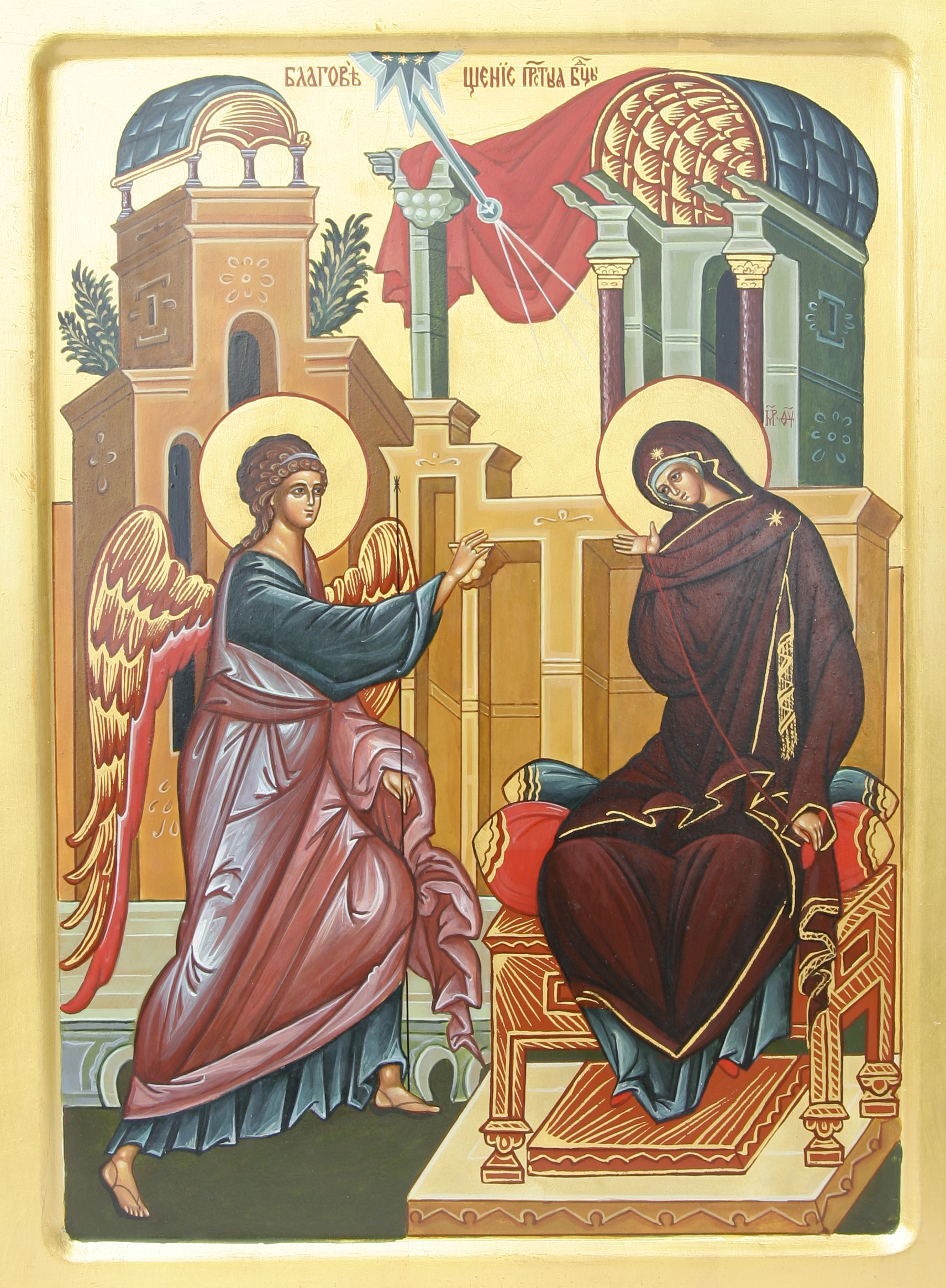 Дева Мария занята, и вдруг перед Ней появляется Архангел Гавриил. Складки плаща Гавриила еще как бы колышутся от быстрого движения. И на землю он ступил лишь одной ногой. Одно крыло Архангела простёрто за спиной, а другое приподнято в знак приветствия Марии. К ней же направлена и поднятая правая рука Архангела. На некоторых иконах Архангел держит в руке белоснежную лилию – символ чистоты и царственного достоинства Его великой Собеседницы.