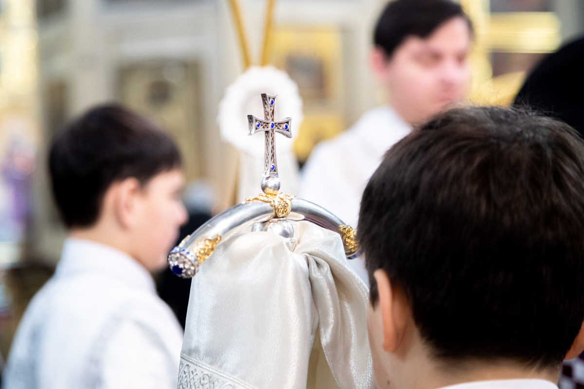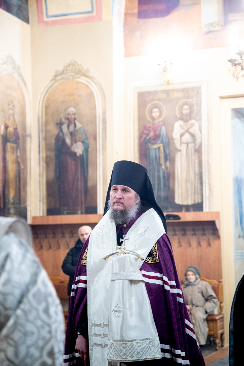 Его Преосвященству сослужили: секретарь Епархиального управления иерей Виктор Тихонов,иерей Виталий Гарабов, иерей Даниил Щербаков, иеродиакон Мефодий Копьев.