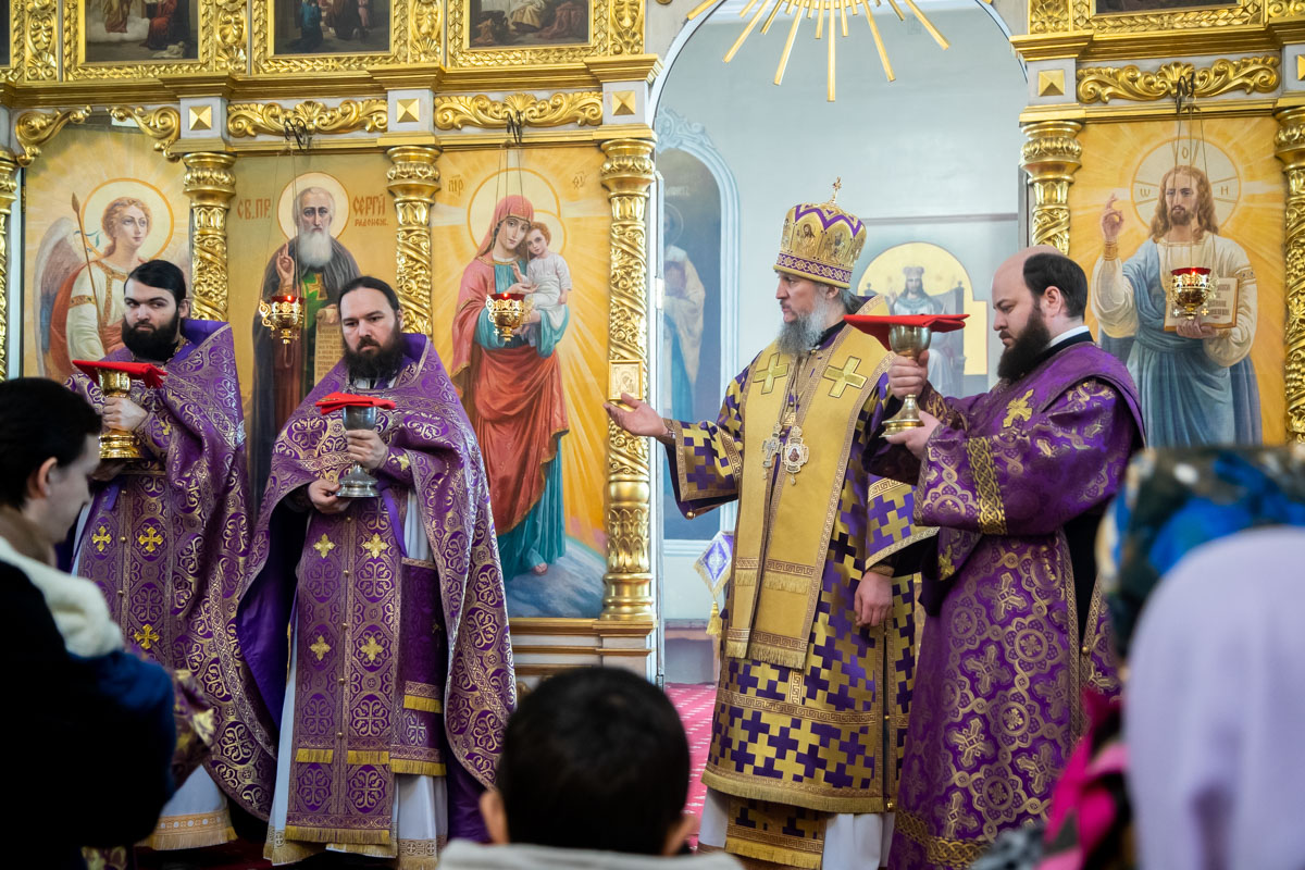 Его Преосвященству сослужили: ключарь собора священник Виктор Тихонов, иерей Николай Андриевский, ирей Даниил Щербаков, иерей Павел Силайчев, иеродиакон Мефодий (Копьев), диакон Иоанн Дунаев, диакон Валерий Гришанин.