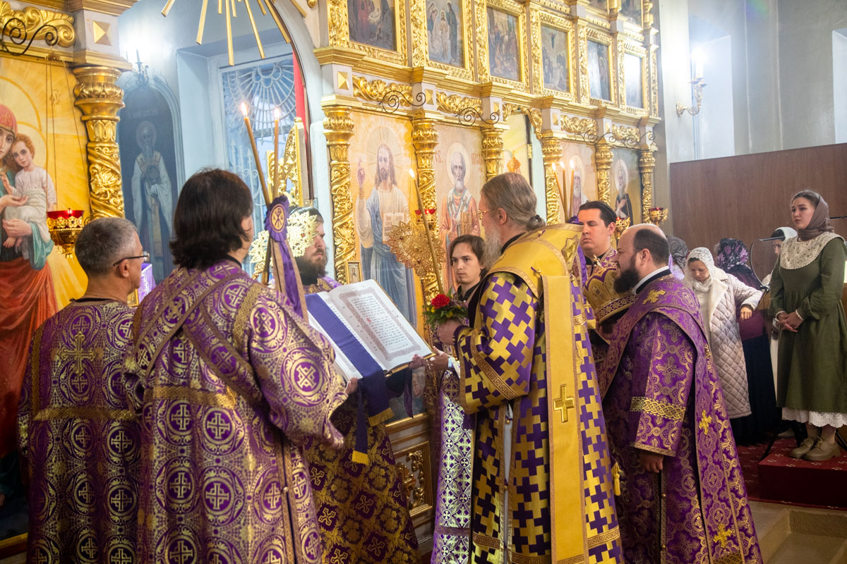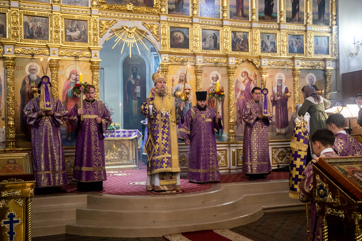 Его Преосвященству сослужили: ключарь собора иерей Виктор Тихонов, иерей Николай Андриевский, иерей Виталий Гарабов, иерей Павел Силайчев, иерей Валерий Гришанин,иеродиакон Мефодий (Копьев), диакон Алексий Ведерников, диакон Иоанн Дунаев, диакон Авдий Зарипов, диакон Димитрий Шувалов.