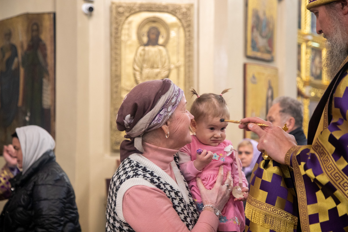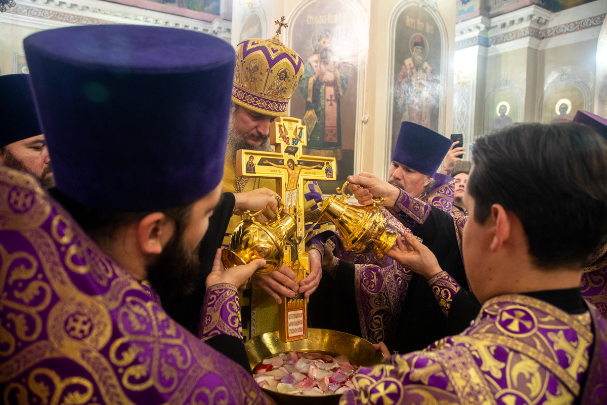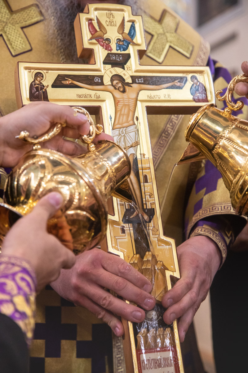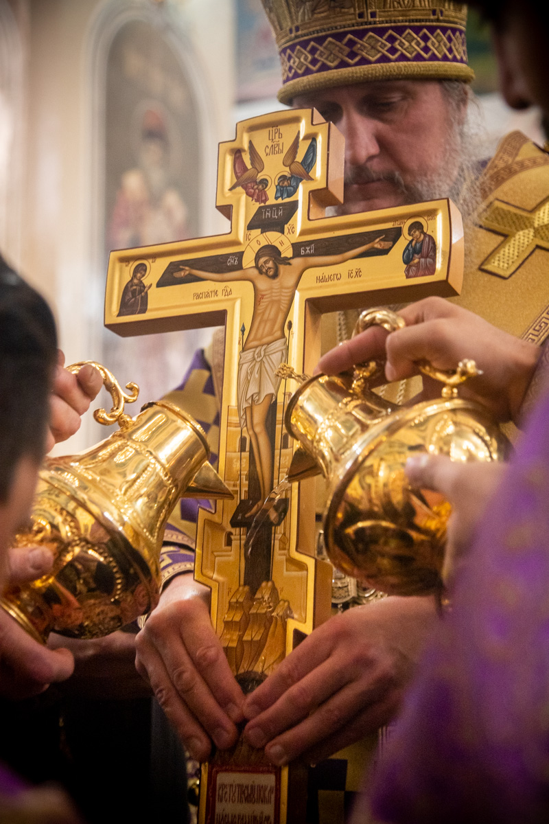 На утрене, после Великого славословия, был совершен Чин Воздвижения Креста, который на Руси известен с XIII столетия. В московском Типиконе 1641 года впервые появляется указание о том, что Крест воздвигают только в соборных храмах и монастырях, а в обычных приходских храмах бывает лишь поклонение Кресту, по чину Крестопоклонной недели. В наши дни чин Воздвижения Креста совершается только в соборных храмах, где служит митрополит или епископ.