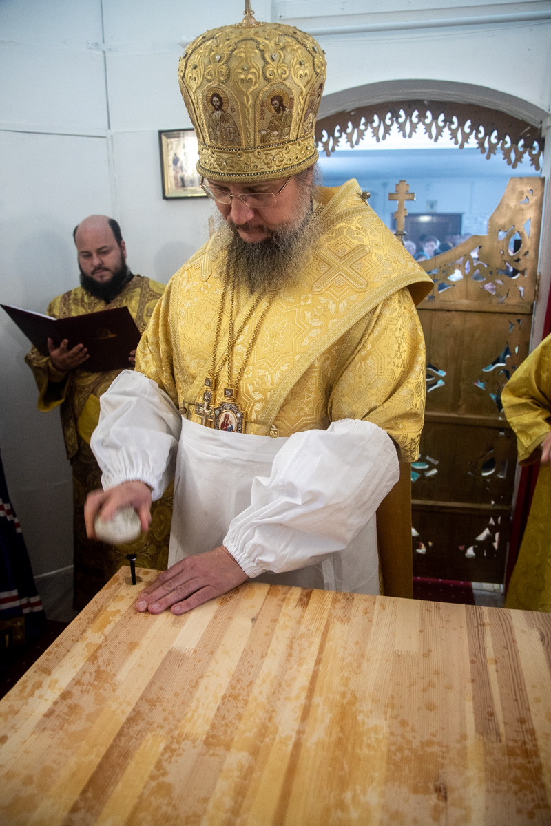 Его Преосвященству сослужили: секретарь Епархиального управления иерей Виктор Тихонов, благочинный округа иерей Александр Филимонов, настоятель храма иерей Георгий Шестов, иерей Валерий Гришанин, иеродиакон Мефодий (Копьев), диакон Алексий Ведерников.