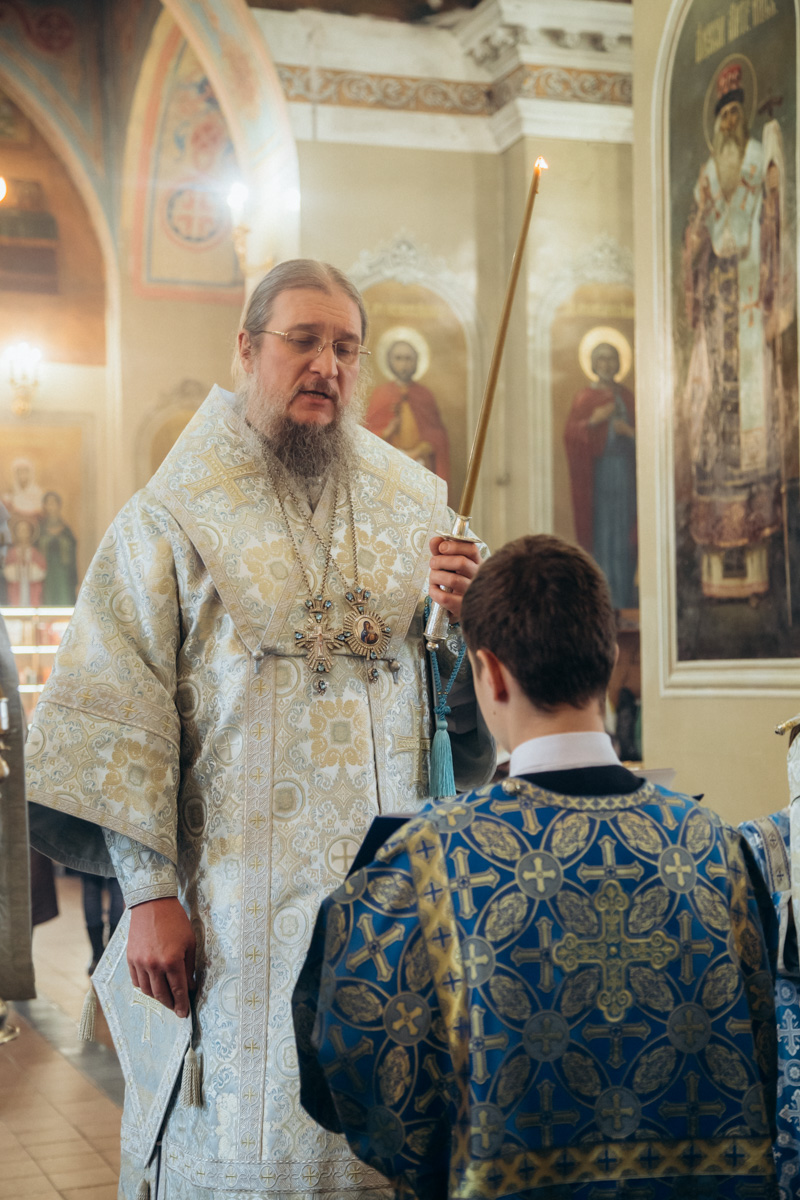 Его Преосвященству сослужили: ключарь собора священник Виктор Тихонов, иерей Николай Андриевский, иерей Виталий Гарабов, иерей Даниил Щербаков, иерей Павел Силайчев, диакон Алексий Ведерников, диакон Иоанн Дунаев.