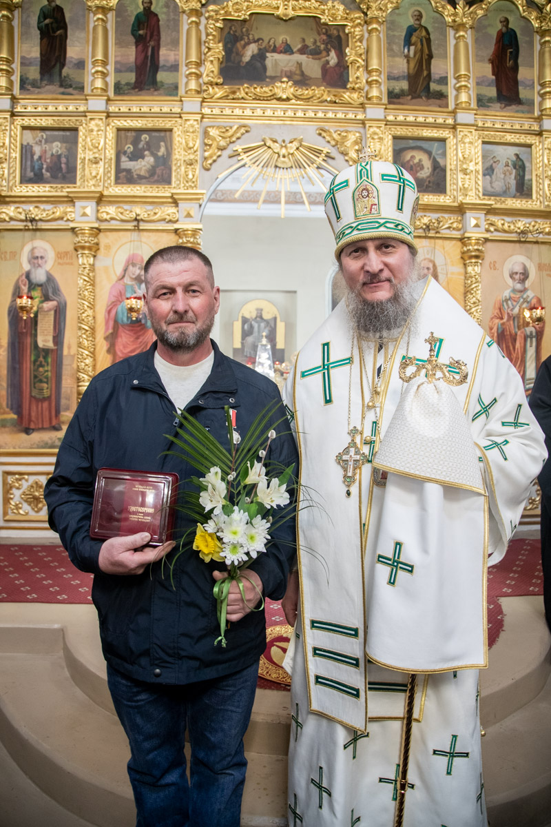 Его Преосвященству сослужили: ключарь собора священник Виктор Тихонов, иерей Николай Андриевский, иерей Виталий Гарабов, иерей Даниил Щербаков, иерей Павел Силайчев, диакон Алексий Ведерников, диакон Иоанн Дунаев.