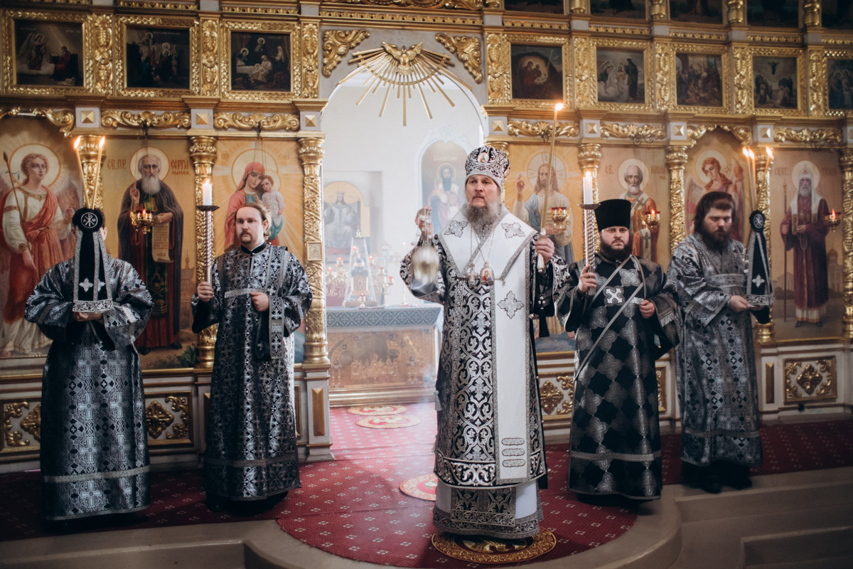 Его Преосвященству сослужили: ключарь собора священник Виктор Тихонов, иерей Николай Андриевский, иерей Виталий Гарабов, иерей Даниил Щербаков, иерей Павел Силайчев, диакон Алексий Ведерников, диакон Иоанн Дунаев.
