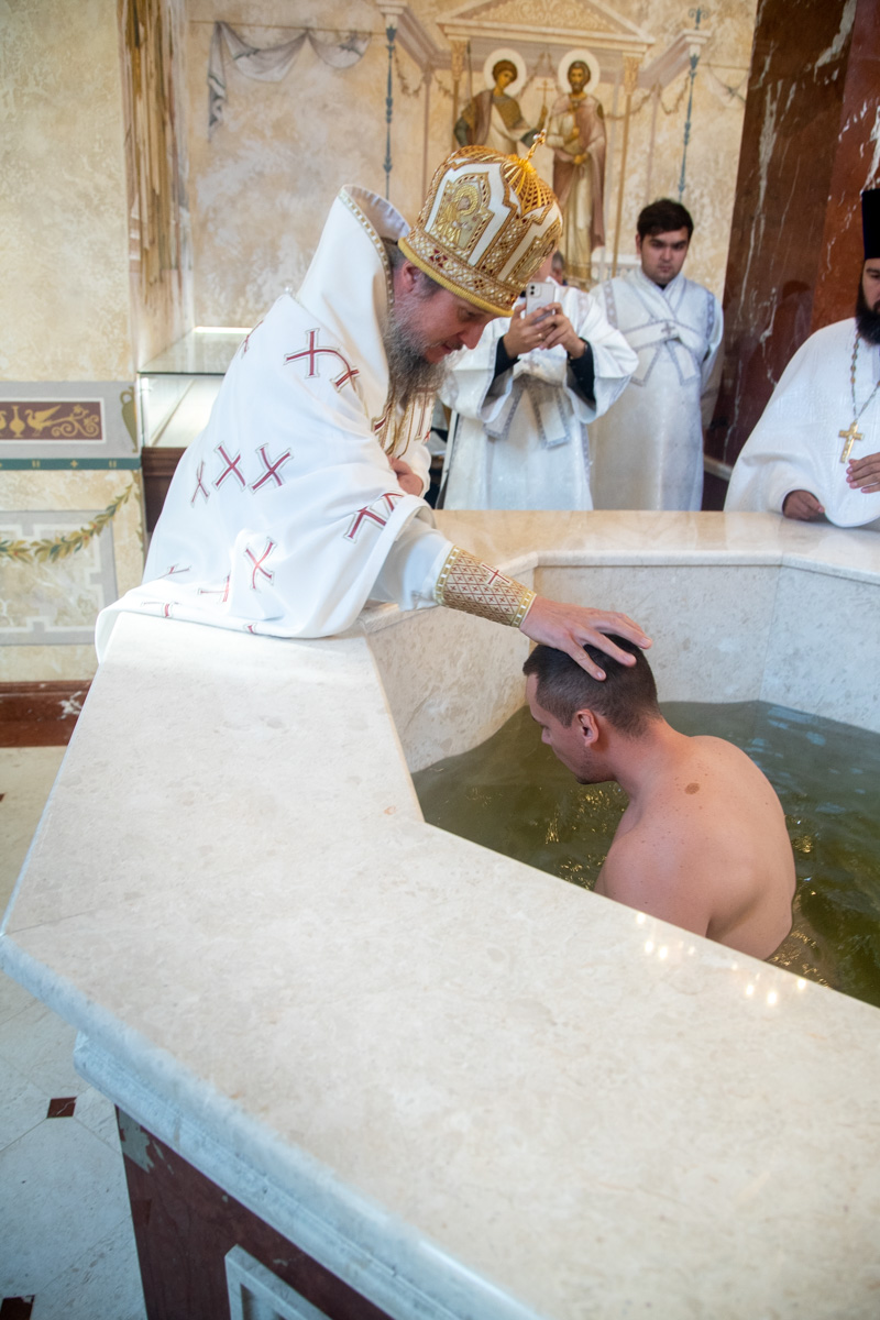 После Крещения новопросвещенные вслед за архипастырем проследовали в храм Казанской иконы Божией Матери, где приняли участие в Литургии и причастились Святых Христовых Таин. Владыка поздравил новокрещенных, вручил им свидетельства и памятные подарки.