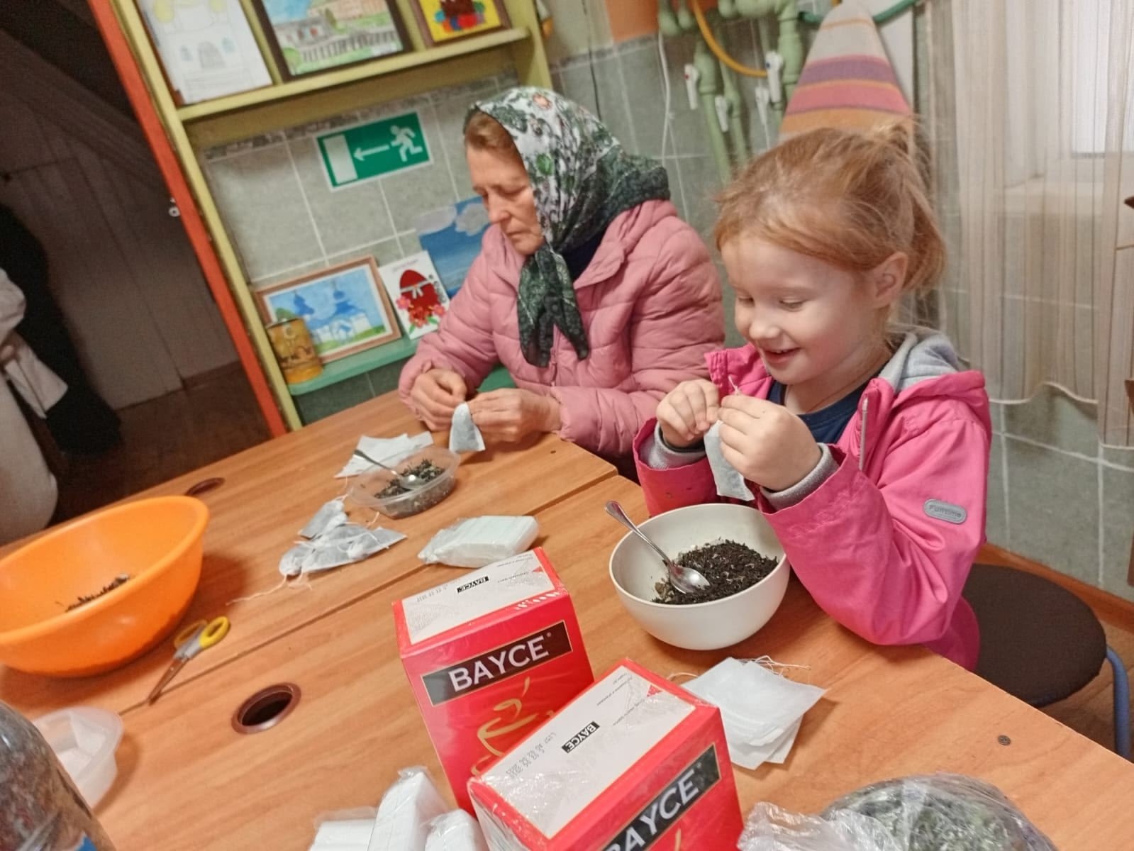 Участники волонтёрской группы "Ильинский благотворитель" продолжают трудиться. Они собрались в художественной мастерской, чтобы расфасовать вкусный чай с травами для наших воинов.