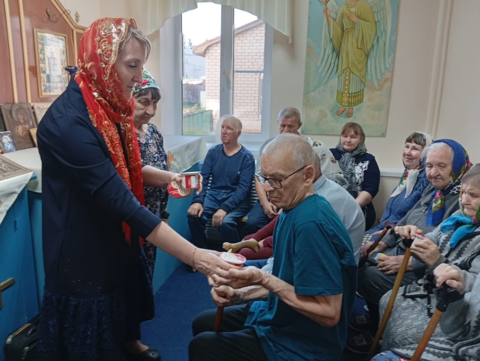 Отец Александр совершил молебен, после которого все желающие смогли исповедаться и причаститься Святых Христовых Таин. После молебна отец Александр поздравил насельников дома-интерната и вручил им специально приобретённые к этому дню сладкие подарки.