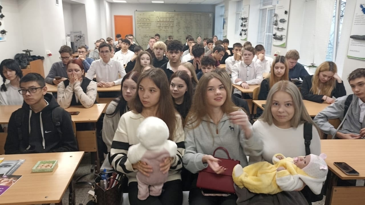 Программа встречи получилась очень насыщенной. Студенты не только посмотрели и обсудили фильмы «Генетический код» и «Беременность изнутри», но и примерили на себя роль родителей, подержав на руках реалистичных кукол-младенцев Эльзу и Валюшу.