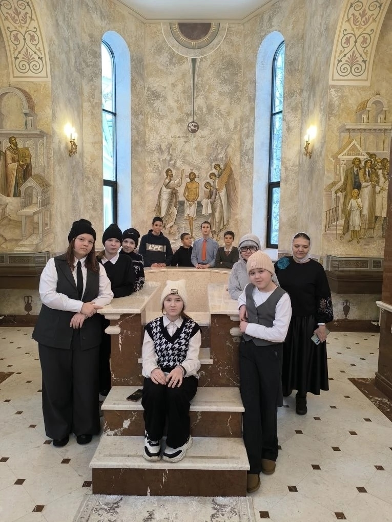 На познавательную тематическую экскурсию ученики 8 класса средней школы №12 г. Нижнекамска собрались 15 декабря на Архиерейском подворье праведного Иоанна Кронштадтского в п. Красный Ключ. Директор воскресной школы «Святой источник» Л.В. Щербакова познакомила их с уникальными росписями крещального храма во имя блаженной Ксении Петербуржской, а также с историей всего подворья.