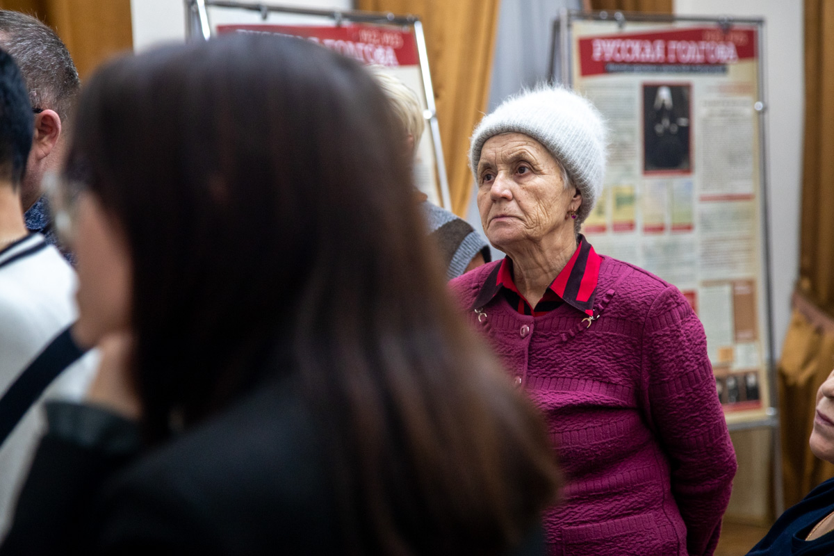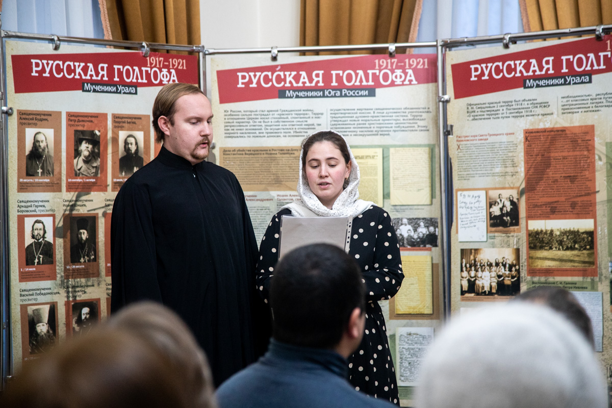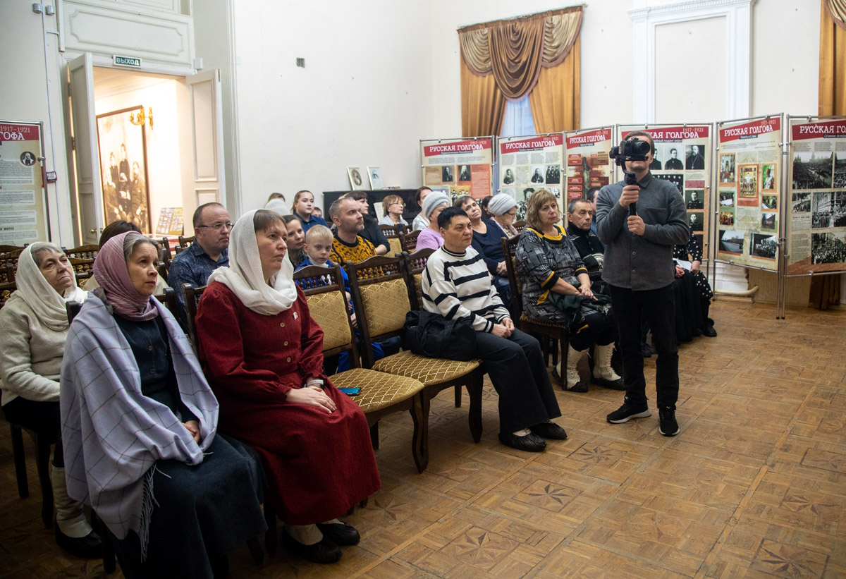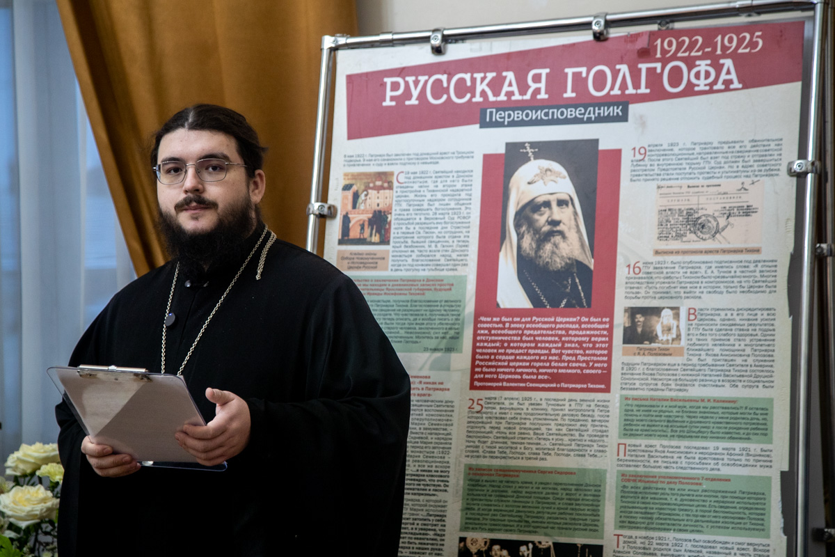 «Сегодняшний вечер посвящён памяти святителя и открытию выставки “Русская Голгофа”, которая переносит нас в ту эпоху, когда сама история говорила голосом трагедии, но и голосом беспримерной стойкости духа. Это годы, в которые Промысл Божий поставил у кормчего руля Русской Церкви святителя Тихона – пастыря кроткого, мудрого, мирного. Человека, которому в бурю было суждено стать камнем – и который действительно стал им», – сказал иерей Павел Силайчев, заместитель руководителя комиссии по канонизации святых, представляя экспозицию.