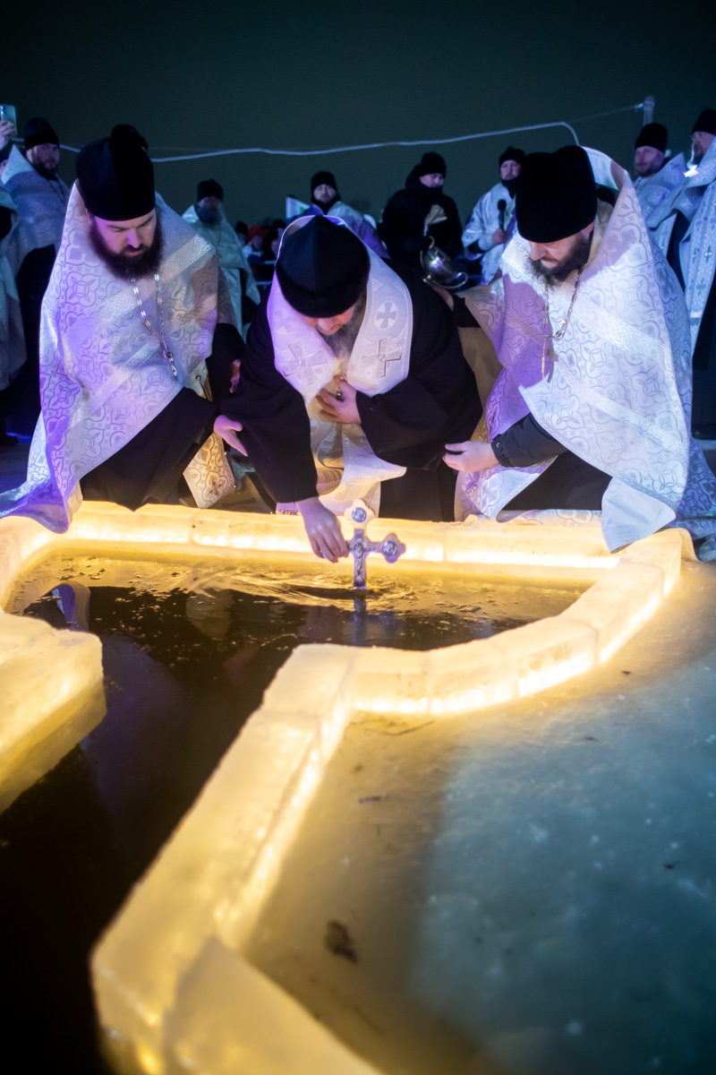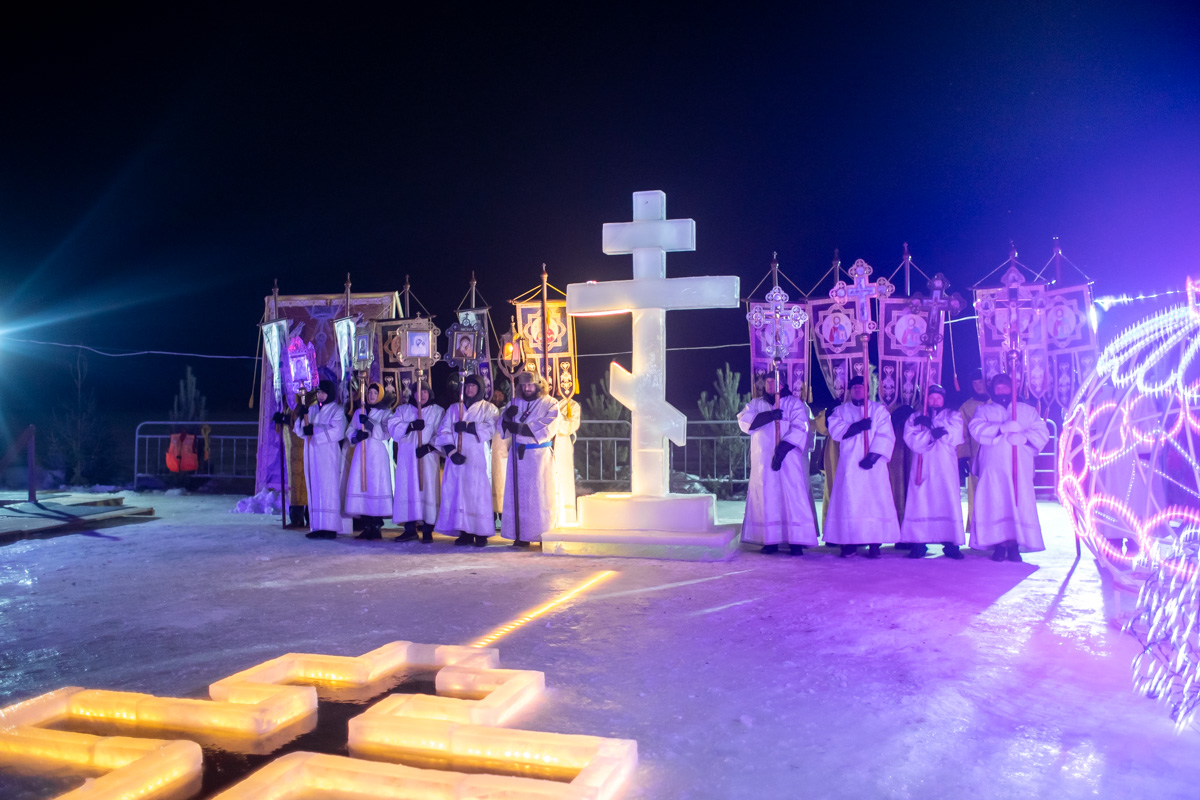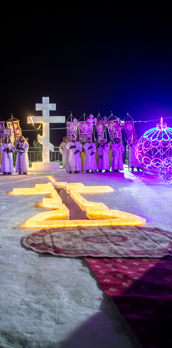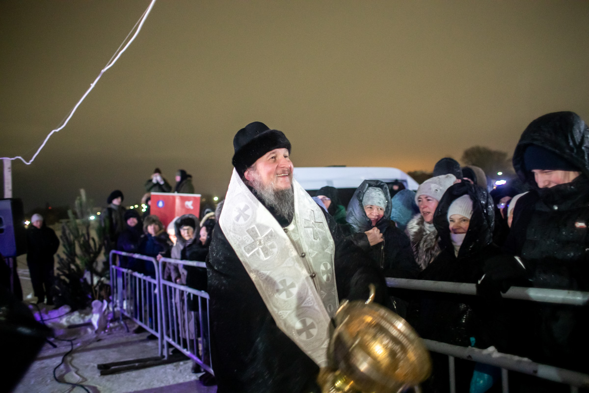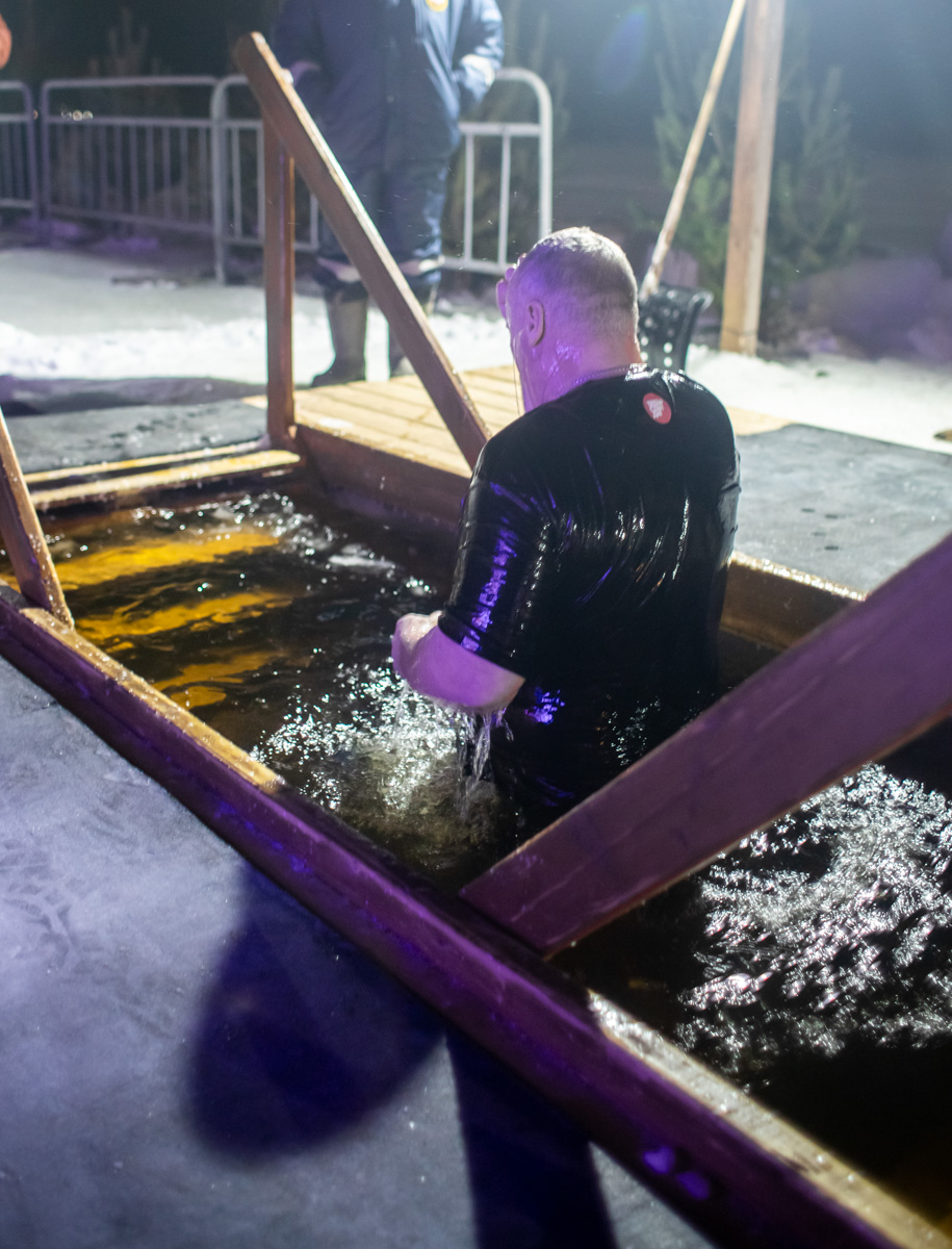У специально вырубленной в виде креста проруби с ледяным распятием – «иордани» – владыка совершил чин великого освящения воды и окропил молящихся святой водой. "В эти дни стоит морозная погода, потому от всей души хочется поблагодарить батюшек и мирян, которые потрудились здесь, на берегу, чтобы у всех было ощущение настоящего праздника", - поделился иерей Виктор Тихонов.