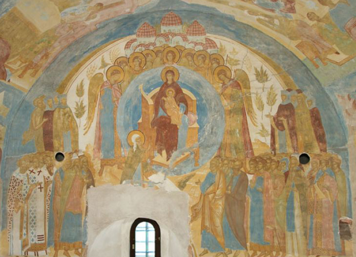 Они могут стать отличной иллюстрацией к уроку, а если позволит время, добавить еще один пункт в его программу: виртуальное паломничество. Фрески в далеком XVI веке писал иконописец Дионисий Мудрый и его сыновья Владимир и Феодосий. Как гласит надпись на откосе храмовой северной двери, они работали в монастыре с 6 августа по 8 сентября 1502 года. Эти иллюстрации можно и нужно рассматривать внимательно, отмечая с какой нежностью относились иконописцы к Матери Божией, чье чудесное рождение мы будем отмечать 21 сентября.